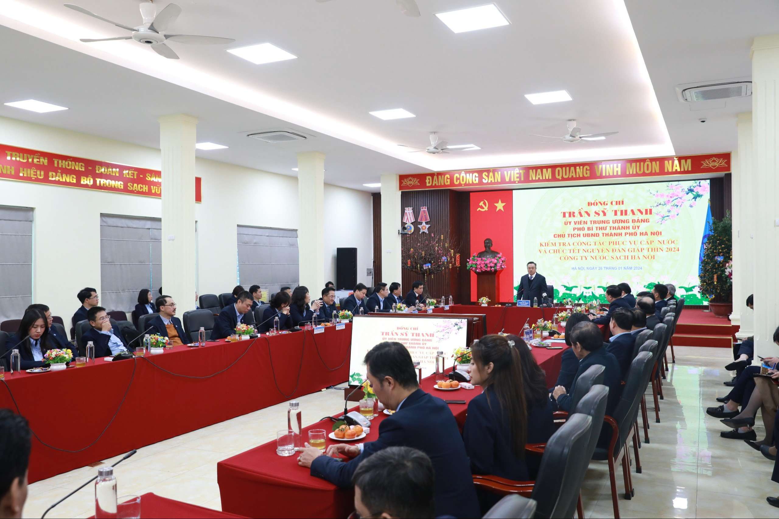 Chiều ngày 26/01/2024, Đoàn công tác của Thành ủy Hà Nội do đồng chí Trần Sĩ Thanh, Uỷ viên BC­H TW Đảng, Phó Bí thư Thành ủy, Chủ tịch UBND Thành phố Hà Nội làm trưởng đoàn đã đến kiểm tra công tác cấp nước phục vụ nhân dân Thủ đô trong dịp Tết Nguyên đán và thăm chúc tết CBCNV Công ty Nước sạch Hà Nội.