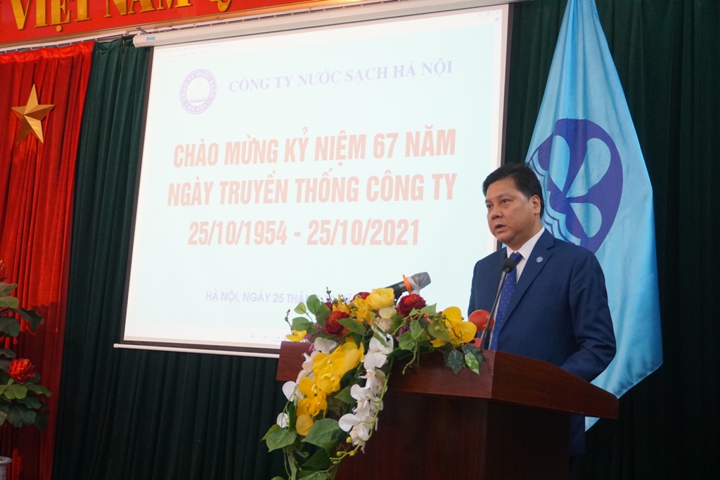 Mở đầu chương trình, ông Nguyễn Bảo Vinh, Bí thư Đảng ủy, Chủ tịch Hội đồng Thành viên đã ôn lại lịch sử của ngành nước Hà Nội. Từ tháng 10/1954, mỗi con phố ở Hà Nội chỉ có một đầu máy nước sinh hoạt chung, người dân phải xếp hàng gánh nước về nhà. Với sự cố gắng, nỗ lực không ngừng của những người công nhân ngành nước qua các thời kỳ, đến nay hệ thống cấp nước Thành phố Hà Nội không ngừng hoàn thiện đáp ứng cấp nước đến từng hộ dân trên địa bàn Thủ đô Hà Nội. Đội ngũ CBCNV trong những năm qua cũng không ngừng trưởng thành, đoàn kết, Công ty đã triển khai hoàn thành Dự án nâng công suất nhà máy nước Bắc Thăng Long lên 150.000 m3/ngđ lấy nguồn từ nguồn nước mặt sông Hồng, đã đánh dấu bước ngoặt về khả năng làm chủ công nghệ, kỹ thuật khai thác xử lý nước mặt song cùng với khai thác nước ngầm. Tỷ lệ nước thu tiền toàn Công ty đạt 85%, hoàn thành mục tiêu theo Quyết định số 2417/QĐ-Ttg của Thủ tướng Chính phủ. Năm 2021, dù gặp nhiều khó khăn do diễn biến phức tạp của dịch bệnh COVID-19 trên địa bàn, Công ty đã áp dụng các biện pháp chủ động đảm bảo an toàn sản xuất cấp nước và phòng chống dịch bệnh. Bên cạnh đó, Công ty vẫn tiếp tục xây dựng kế hoạch cải tạo mạng lưới chống thất thoát thất thu nước sạch, kiểm soát chất lượng nước online, hoàn thiện công tác thu tiền nước trực tuyến không dùng tiền mặt… để không ngừng nâng cao dịch vụ cấp nước trong các năm tiếp theo.