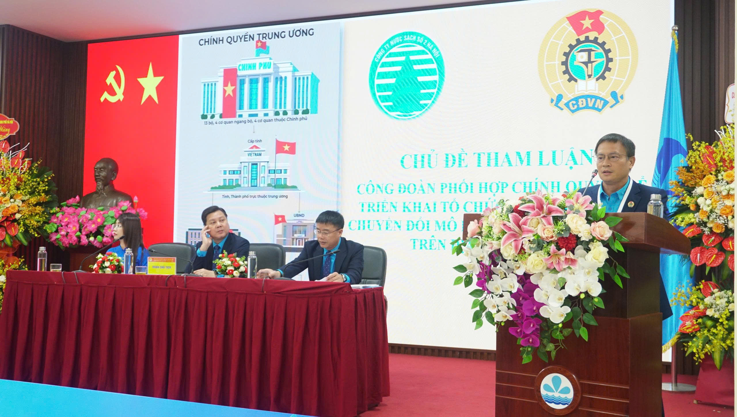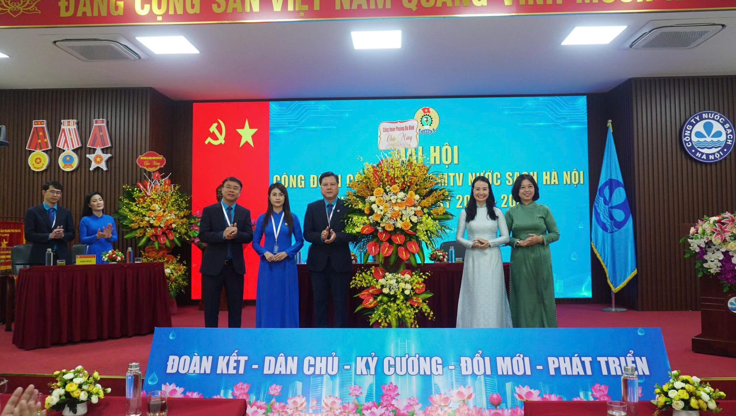 Thay mặt Đảng ủy, Hội đồng Thành viên, Ban Tổng Giám đốc Công ty Nước sạch Hà Nội, ông Đặng Ngọc Hải, Bí thư Đảng ủy, Tổng Giám đốc đã phát biểu ý kiến chỉ đạo tại Đại hội. Ghi nhận và biểu dương những thành tích mà Công đoàn Công ty đã đạt được trong nhiều năm qua, Bí thư Đảng ủy Công ty khẳng định Công đoàn Công ty đã thực hiện tốt công tác chăm lo, bảo vệ quyền và lợi ích chính đáng của người lao động. Với lực lượng lao động 100% là đoàn viên công đoàn đã đồng hành cũng Ban lãnh đạo Công ty trong công tác chuyên môn, triển khai thực hiện các yêu cầu, nhiệm vụ chính trị của HĐND, UBND Thành phố giao. Công đoàn Công ty đã quy tụ và tập hợp lực lượng cải thiện điều kiện làm việc và đảm bảo công tác an toàn lao động trong toàn Công ty. Phối hợp trong công tác chuyên môn, tiên phong trong các phong trào thi đua sản xuất, mang lại lợi ích cho doanh nghiệp, đoàn viên công đoàn và xã hội. Công đoàn đã hỗ trợ người lao động có hoàn cảnh khó khăn, ủng hộ người dân và một số đơn vị cấp nước chịu thiệt hại do thiên tai. Dưới sự chỉ đạo của Ban lãnh đạo Công ty, đoàn viên công đoàn đã thực hiện tốt vai trò thúc đẩy ứng dụng công nghệ thông tin, chuyển đổi số, nâng cao chất lượng dịch vụ khách hàng thông qua việc thực hiện: Tự động hóa vận hành các nhà máy nước, quản lý hệ thống mạng lưới trên phần mềm, nâng cấp tổng đài chăm sóc khách hàng, triển khai thực hiện văn phòng điện tử… Đặc biệt là sự ra mắt của Trung tâm vận hành cấp nước Công ty NSHN, đây là biểu tượng của tinh thần đổi mới, ứng dụng khoa học kỹ thuật hiện đại vào quản lý vận hành hệ thống cấp nước phục vụ nhân dân trên địa bàn Công ty quản lý cấp nước. Ban lãnh đạo và Công đoàn Công ty đánh giá cao tinh thần trách nhiệm và khả năng tổ chức thực hiện của đoàn viên công đoàn luôn là lực lượng tiên phong trong công tác thi đua lao động với kết quả hoàn thành và hoàn thành vượt mức các chỉ tiêu SXKD của Thành phố giao. Trong nhiệm kỳ mới, cùng cả nước bước vào kỷ nguyên mới, Đảng ủy Công ty giao nhiệm vụ cho BCH Công đoàn Công ty tiếp tục kế thừa và phát huy những truyền thống tốt đẹp, thực hiện nghiêm túc, triển khai có hiệu quả, sáng tạo tinh thần các Nghị quyết của Đảng từ TW, Thành ủy đến Đảng ủy UBND Thành phố HN. Triển khai có hiệu quả các chỉ đạo của Tổng LĐLĐ Việt Nam, LĐLĐ Việt Nam Thành phố Hà Nội, Công đoàn phường Ba Đình. Cụ thể hóa các chương trình hoạt động và nội dung cụ thể thiết thực gắn với hoạt động sản xuất kinh doanh thực tế của Công ty nhưng vẫn mang lại lợi ích chung cho người lao động. Bám sát và thực hiện theo Nghị quyết Đại hội Đảng bộ Công ty TNHH MTV Nước sạch Hà Nội thông qua 03 chương trình công tác với các chủ đề cụ thể: “Chương trình công tác số 01: Nâng cao năng lực lãnh đạo, sức chiến đấu của cấp ủy Đảng, đội ngũ đảng viên và các tổ chức đoàn thể; Chương trình công tác số 02: Tập trung phát triển nguồn, phát triển mạng và cấu trúc mạng lưới cấp nước, công tác cấp nước an toàn và chống thất thoát nước sạch giai đoạn 2025-2030; Chương trình công tác số 03: Đẩy mạnh phát triển công nghệ, đổi mới sáng tạo và chuyển đổi số vào công tác sản xuất nước sạch, quản lý mạng lưới cấp nước và chăm sóc khách hàng sử dụng nước. Vận động đoàn viên Công đoàn nâng cao trình độ học vấn, chuyên môn nghiệp vụ, kỹ năng nghề nghiệp và ý thức tổ chức kỷ luật”. Tiếp tục quan tâm sâu sát đến đời sống người lao động, đảm bảo thu nhập, phúc lợi, điều kiện làm việc cho CBCNV. Đẩy mạnh phong trào thi đua đặc biệt là phong trào “Sáng kiến, sáng tạo”, “Cải tiến kỹ thuật”, “Tiết kiệm chi phí”, “An toàn lao động”… Tích cực đồng hành trong công tác chuyên môn để ứng dụng chuyển đổi số và hiện đại hóa hệ thống cấp nước phục vụ khách hàng ngày một tốt hơn. Xây dựng đội ngũ CBCNVLĐ có tay nghề cao, có bản lĩnh chính trị vững vàng sẵn sàng đương đầu với mọi thử thách. BCH Công đoàn tập trung nghiên cứu, xây dựng chương trình toàn khóa từ nay đến năm 2030. Trong giai đoạn mới, dù gặp nhiều khó khăn ban đầu nhưng với sự đoàn kết đồng lòng của Đảng ủy, Ban Tổng Giám đốc, tổ chức Công đoàn cùng toàn thể CBCNV Công ty quyết tâm hoàn thành xuất sắc mọi nhiệm vụ được giao.