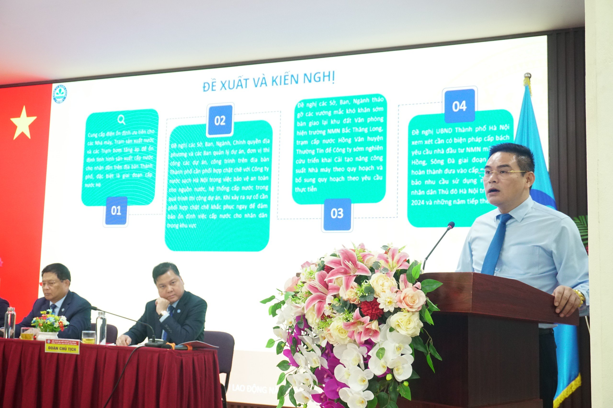 Thừa ủy quyền của Tổng Giám đốc, ông Đặng Ngọc Hải, Phó Tổng Giám đốc đã trình bày báo cáo thực hiện Nghị quyết Hội nghị người lao động năm 2023, phương hướng nhiệm vụ năm 2024. Năm 2023, tình hình kinh tế xã hội của Thủ đô có xu hướng phục hồi, ổn định tuy nhiên sự biến động địa chính trị thế giới đã tác động ảnh hưởng đến giá nguyên, nhiên vật liệu đầu vào tăng cao; Các dự án phát triển nguồn nước mặt sông Hồng, sông Đà giai đoạn 2 chưa đưa vào sử dụng. Nguồn nước mặt sông Đuống cung cấp cho khu vực phía Nam sông Hồng cũng đã tới hạn…trong khi đó nguồn nước ngầm của một số Nhà máy suy giảm. Tập thể Ban lãnh đạo và CBCNV Công ty Nước sạch Hà Nội đã tập trung nguồn nội lực sẵn có, hoàn thành các chỉ tiêu sản xuất kinh doanh của Thành ủy, UBND Thành phố giao. Cụ thể: Tổng sản lượng nước cấp (Công ty Mẹ): 240.008.743 m3 tương đương đạt 657.550 m3/ngđ, đạt 102,92% KH. Chỉ tiêu cấp nước đạt 130 ÷ 135 lít/người/ngđ. Tỷ lệ Nước thu tiền đạt 87,69%, tăng 0,59% so với KH. Tổng doanh thu đạt 109% KH. Nộp ngân sách nhà nước đạt 111% KH, tăng 18% so với năm 2022. Ngoài ra, Công ty tập trung đầu tư cho công tác chống suy thoái nguồn nước, nâng cao năng lực sản xuất, cải tạo kết cấu lại hệ thống mạng cấp nước, chống TTTT nước sạch và đẩy mạnh ứng dụng công nghệ số cũng như chỉnh trang cơ sở vật chất nơi làm việc… đảm bảo mục tiêu nâng cao năng lực sản xuất, dịch vụ cấp nước…theo quy hoạch và phát triển Công ty.