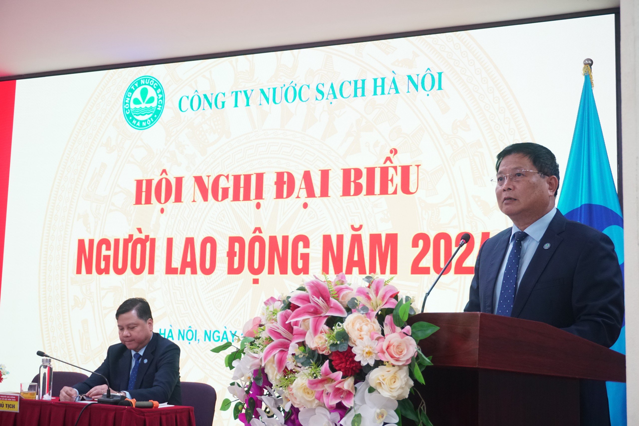 Hội nghị đã lắng nghe ông Nguyễn Trường Sơn, Bí thư Đảng ủy khối doanh nghiệp Hà Nội chúc mừng những thành tích đã đạt được trong năm vừa qua của Công ty Nước sạch Hà Nội. Đồng thời đánh giá cao công tác chuẩn bị và công tác tổ chức Hội nghị người lao động của Công ty. Thành công của Hội nghị là phát huy cao tinh thần truyền thông đoàn kết thống nhất dân chủ, người lao động đều được trình bày tâm tư nguyện vọng trở thành Nghị quyết tập thể, nguyên tắc tập trung dân chủ. Dưới sự lãnh đạo của Đảng, Công ty Nước sạch Hà Nội đã thực hiện tốt các nhiệm vụ được giao, chức năng nhiệm của của Đảng ủy theo đúng Quy định số 08 ngày 20/12/2021 của Ban Bí thư về tổ chức Đảng trong doanh nghiệp Nhà nước. Phải có trách nhiệm lãnh đạo toàn diện từ sản xuất kinh doanh, công tác chính trị tư tưởng, tổ chức cán bộ, kiểm tra giám sát, đổi mới phương thức lãnh đạo của Đảng, các đoàn thể chính trị như Công đoàn, Đoàn thanh niên, Hội cựu chiến binh... Công tác tổ chức cán bộ, đào tạo bồi dưỡng, quy hoạch cán bộ với tầm nhìn bao quát, thế hệ sau được vun đắp, đào tạo tiếp nối truyền thống của thế hệ đi trước, đáp ứng yêu cầu hội nhập trong thời đại mới.