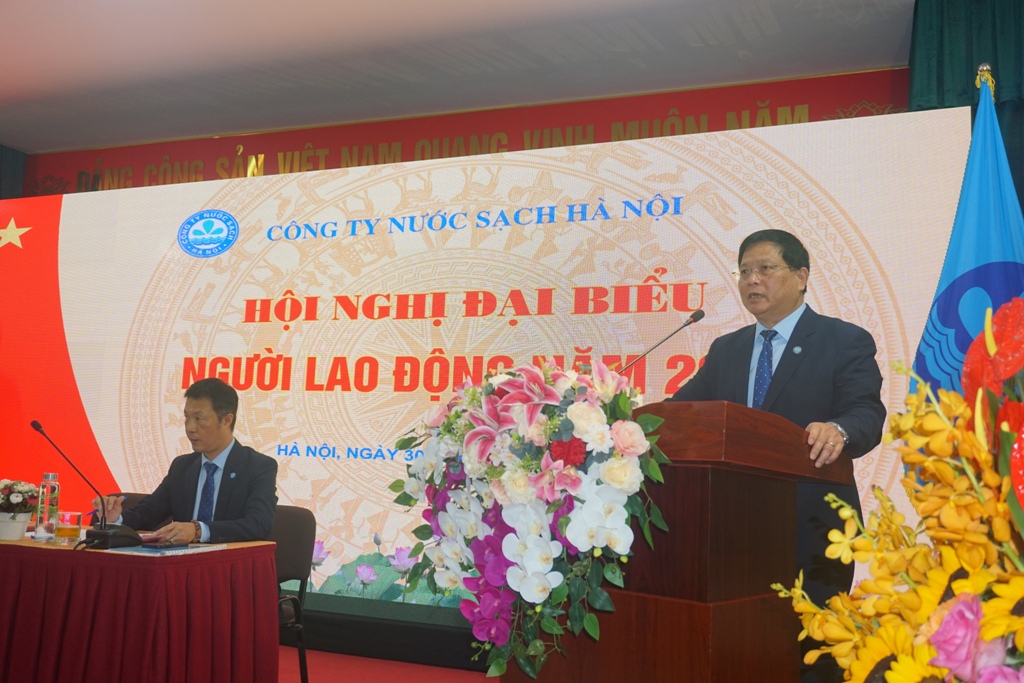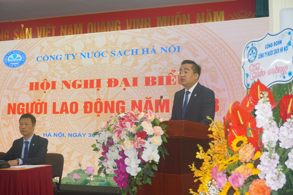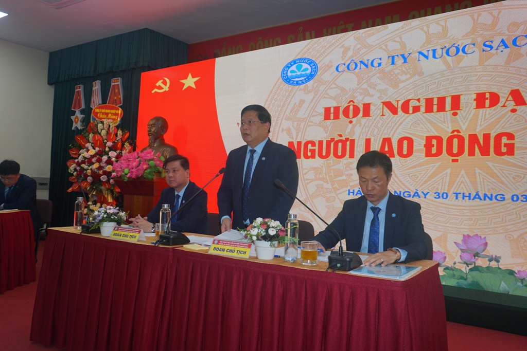 Thừa ủy quyền Tổng Giám đốc, ông Trần Xuân Cương, Phó Tổng Giám đốc đã trình bày tóm tắt báo cáo thực hiện Nghị quyết Hội nghị người lao động năm 2022, phương hướng nhiệm vụ năm 2023. Năm 2022, mặc dù kinh tế xã hội phục hồi chậm do ảnh hưởng của dịch Covid-19, nguồn kinh phí gặp nhiều hạn chế do giá nước chưa được điều chỉnh, tập thể Ban lãnh đạo và toàn thể CBCNV Công ty đã có nhiều cố gắng hoàn thành nhiệm vụ bảo đảm cấp nước và hoàn thành cơ bản các chỉ tiêu SXKD và bảo toàn vốn và tài sản Thành phố giao. Cụ thể: Tổng sản lượng nước cấp vào mạng: 225.153.756 m3, đạt 98,65% KH. Chỉ tiêu cấp nước đạt 130 lít/người/ngày. Tỷ lệ nước thu tiền đạt 87%, tăng 1,1% KH. Nộp ngân sách đạt 105,16% KH. Thu nhập người lao động đạt: 11.886.000 đồng/người/tháng. Ngoài ra, Công ty đã bố trí, huy động vốn tập trung đầu tư cho công tác chống suy thoái nguồn nước, cải tạo kết cấu lại hệ thống mạng cấp nước và đẩy mạnh ứng dụng công nghệ số cũng như chỉnh trang cơ sở vật chất nơi làm việc,… đảm bảo mục tiêu nâng cao năng lực sản xuất cấp nước theo quy hoạch và phát triển Công ty.