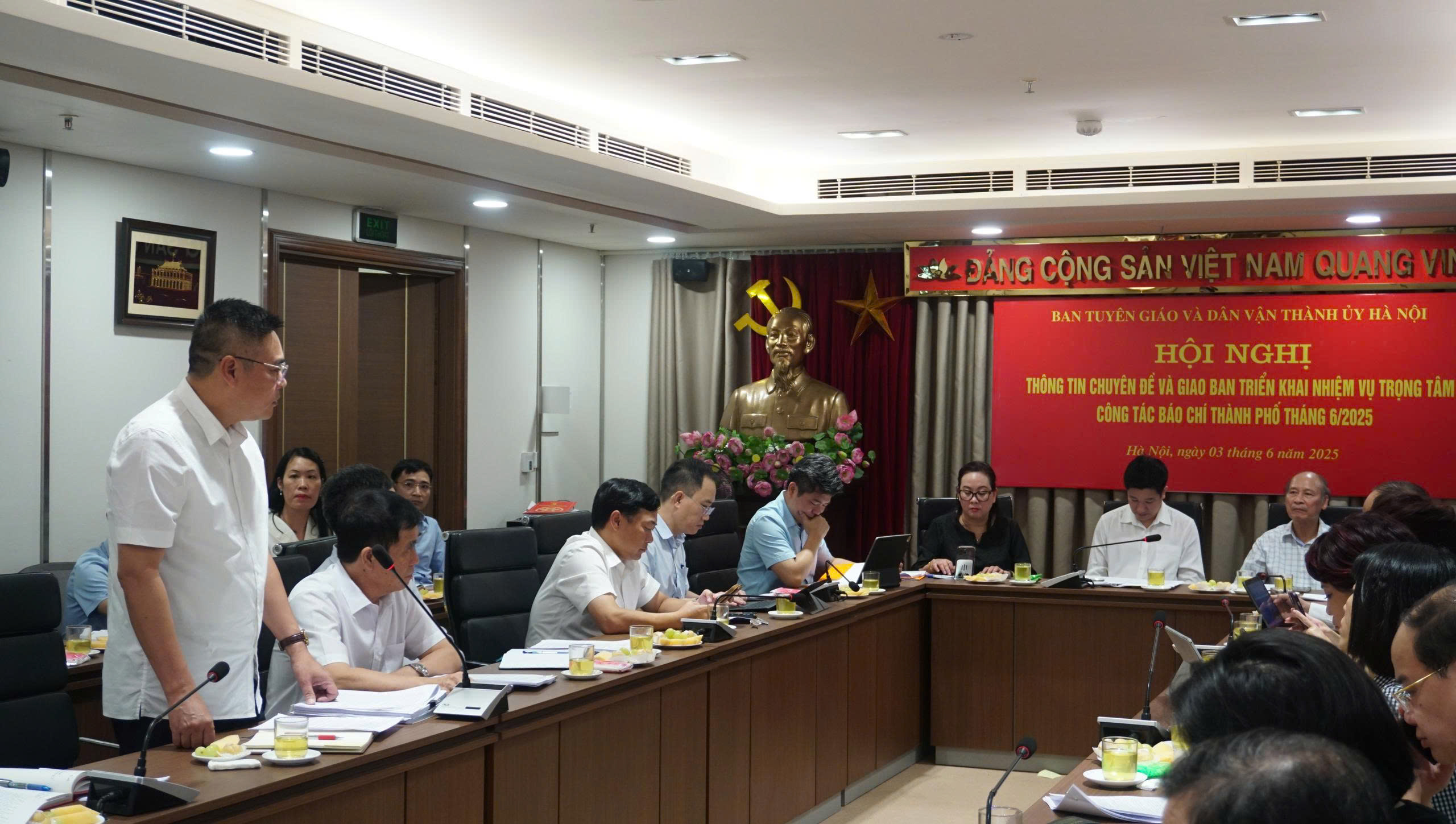Chủ trì Hội nghị có ông Nguyễn Huy Cường, Phó Trưởng ban Tuyên giáo và Dân vận Thành ủy; Bà Bạch Liên Hương, Giám đốc Sở Văn hóa và Thể thao; Ông Kiều Thanh Hùng, Phó Chủ tịch Thường trực Hội nhà báo Hà Nội và các phóng viên đại diện các cơ quan thông tấn, báo chí.